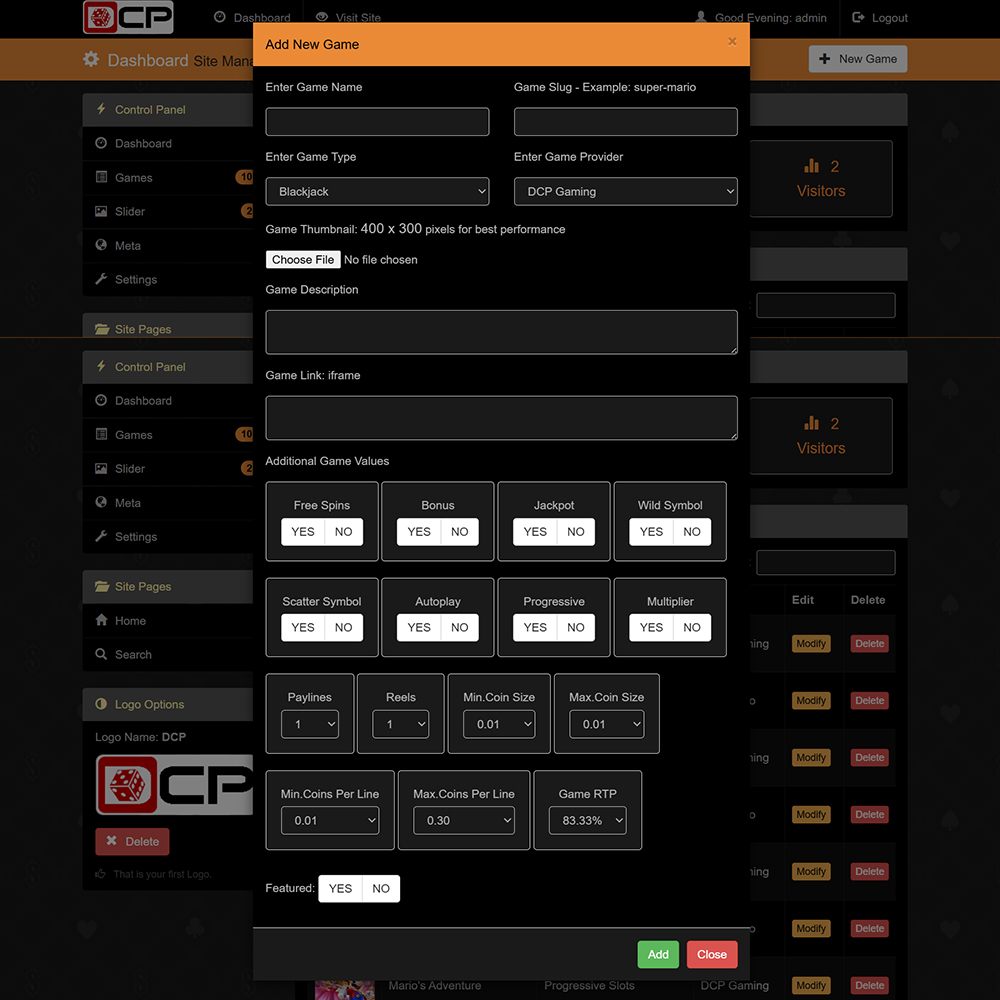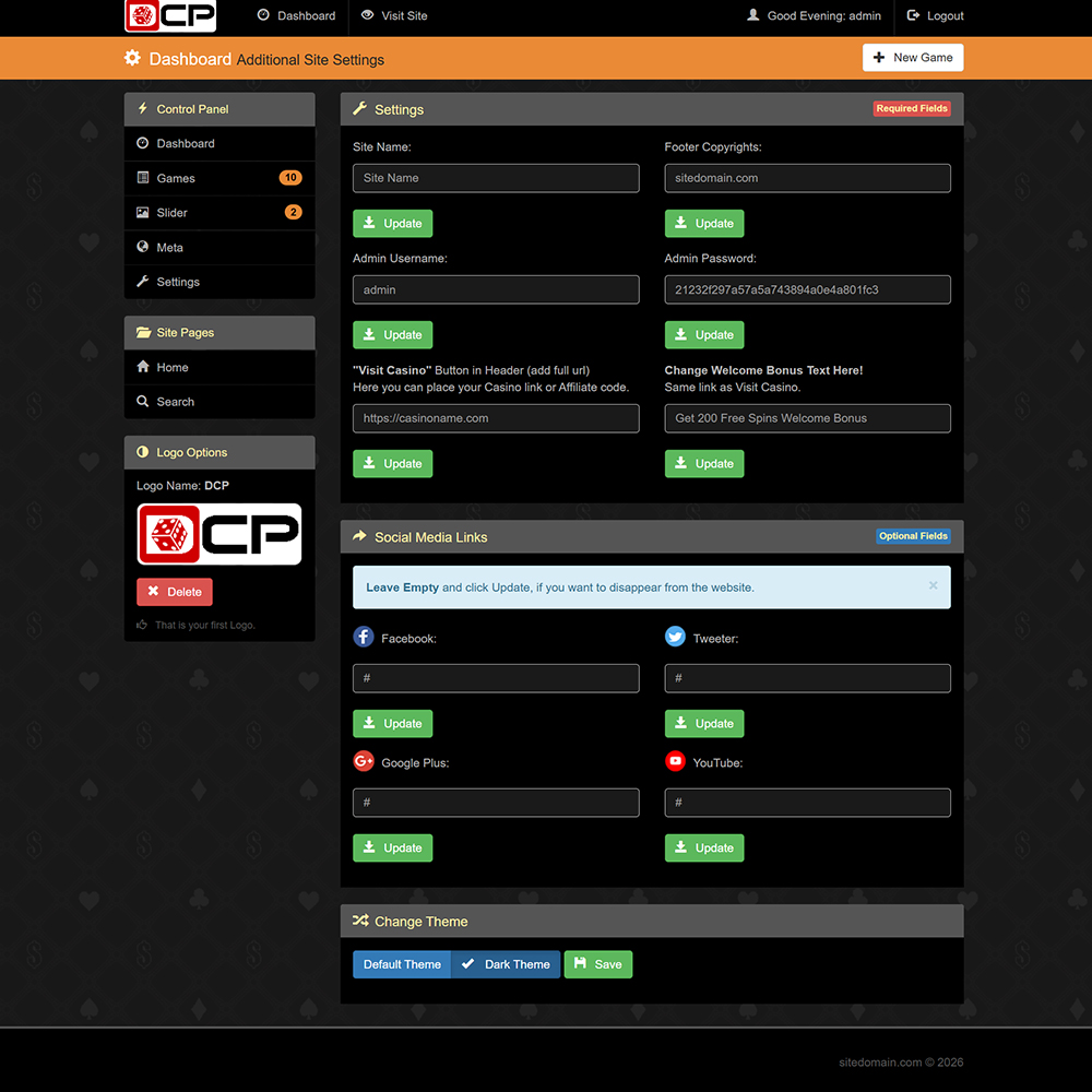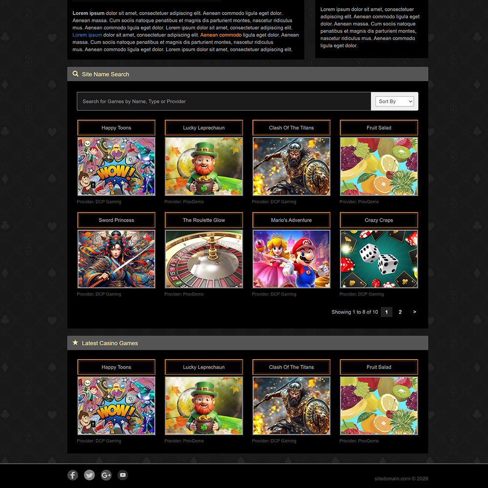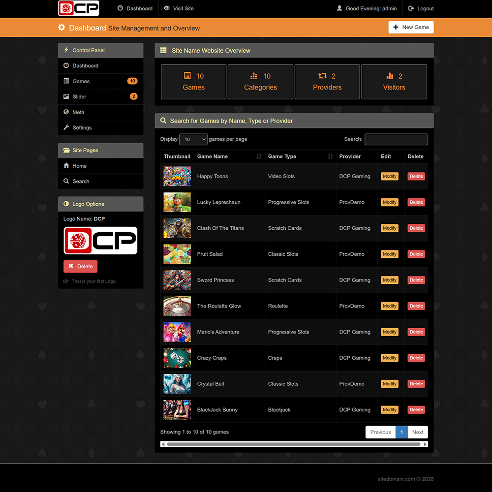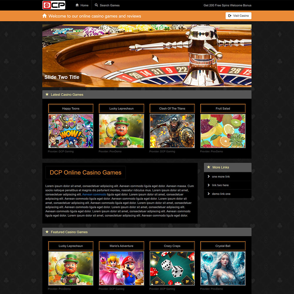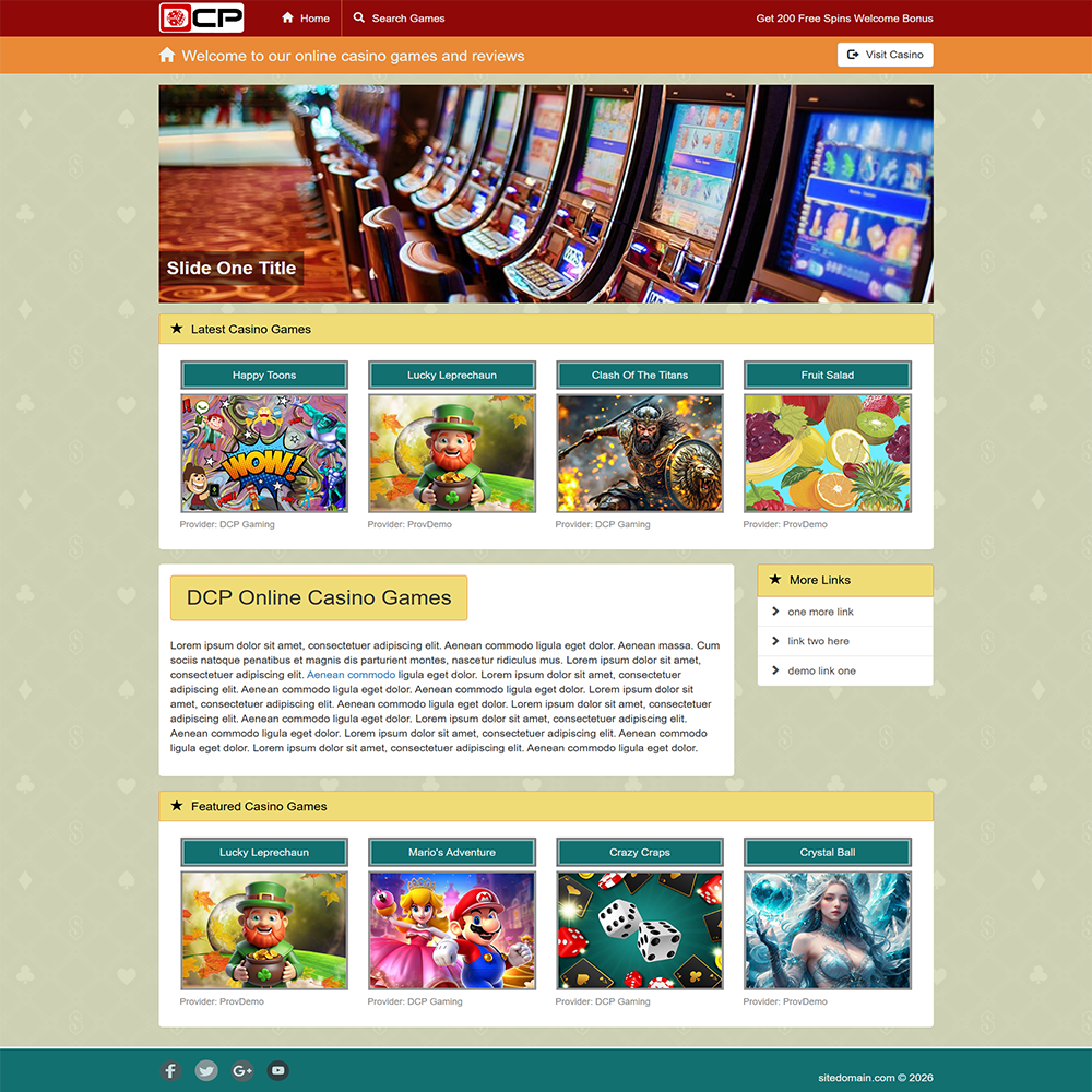 DCP е напълно адаптивен, SEO-оптимизиран онлайн казино портал, предназначен за популяризиране на демо казино игри и казино платформи с истински пари. Изграден с помощта на Bootstrap v3.3.7, bxSlider v4.2.12, PHP, MySQL, AJAX и съвременни принципи на адаптивен дизайн, DCP предоставя мощна и гъвкава система за управление на съдържанието, специално пригодена за нишата на iGaming.